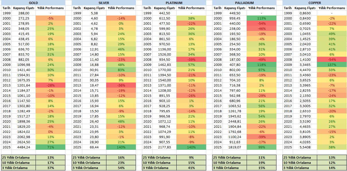 Ons Gümüş ve Platin yıl içerisinde %160’a yaklaşan performanslarıyla tarihsel zirve reaksiyonlarını verirken, Paladyum üç haneli getiri eşiğini aşarak zayıf seyrin ardından güçlü bir toparlanma sinyali üretti. Buna karşın Bakır, 2009 yılındaki %137’lik ralli performansının oldukça gerisinde kalarak 2025 yılında bu grup içerisindeki en sınırlı getiriyi sundu.